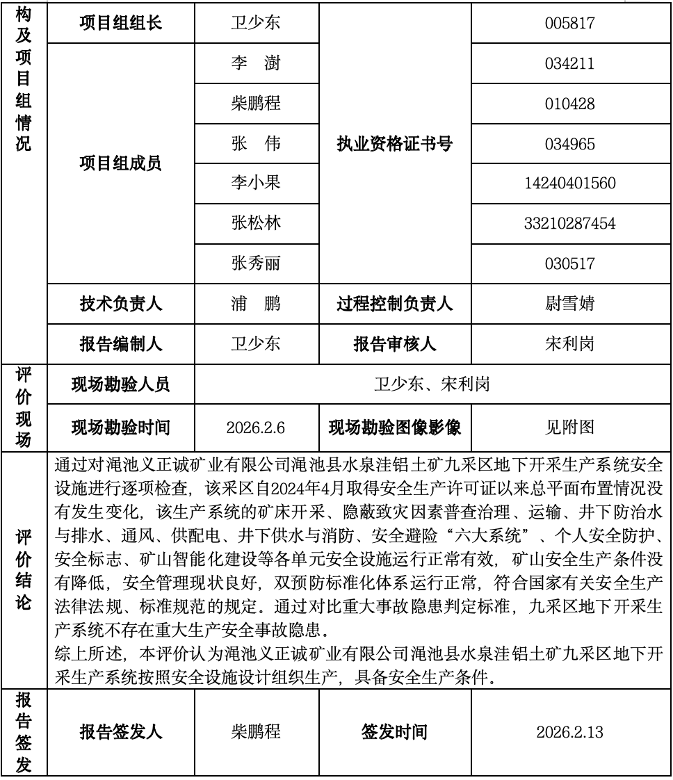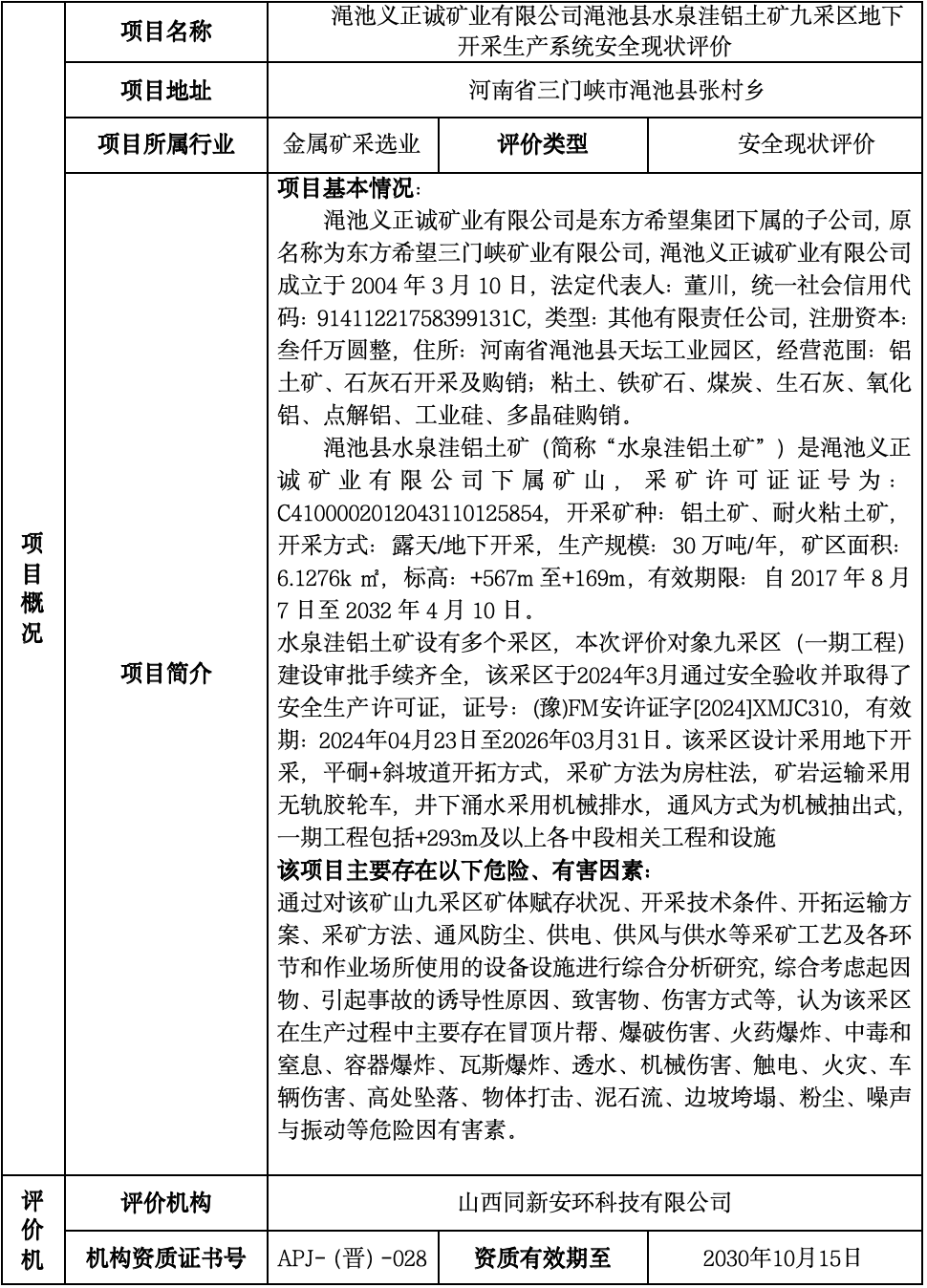 渑池义正诚矿业有限公司渑池县水泉洼铝土矿九采区地下开采生产系统安全现状评价